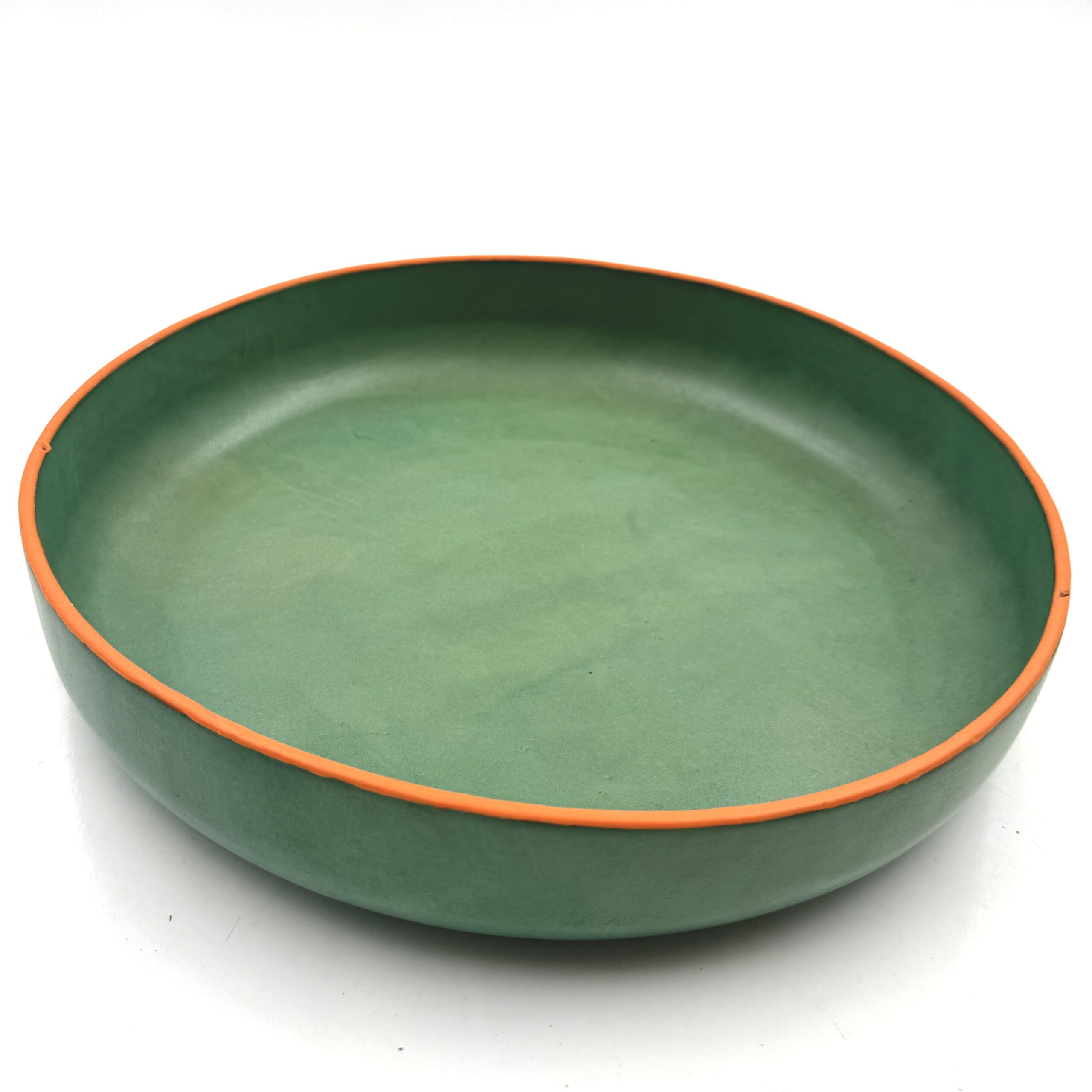 Green leather bowl with orange edge. Artist: José Luis Bazán