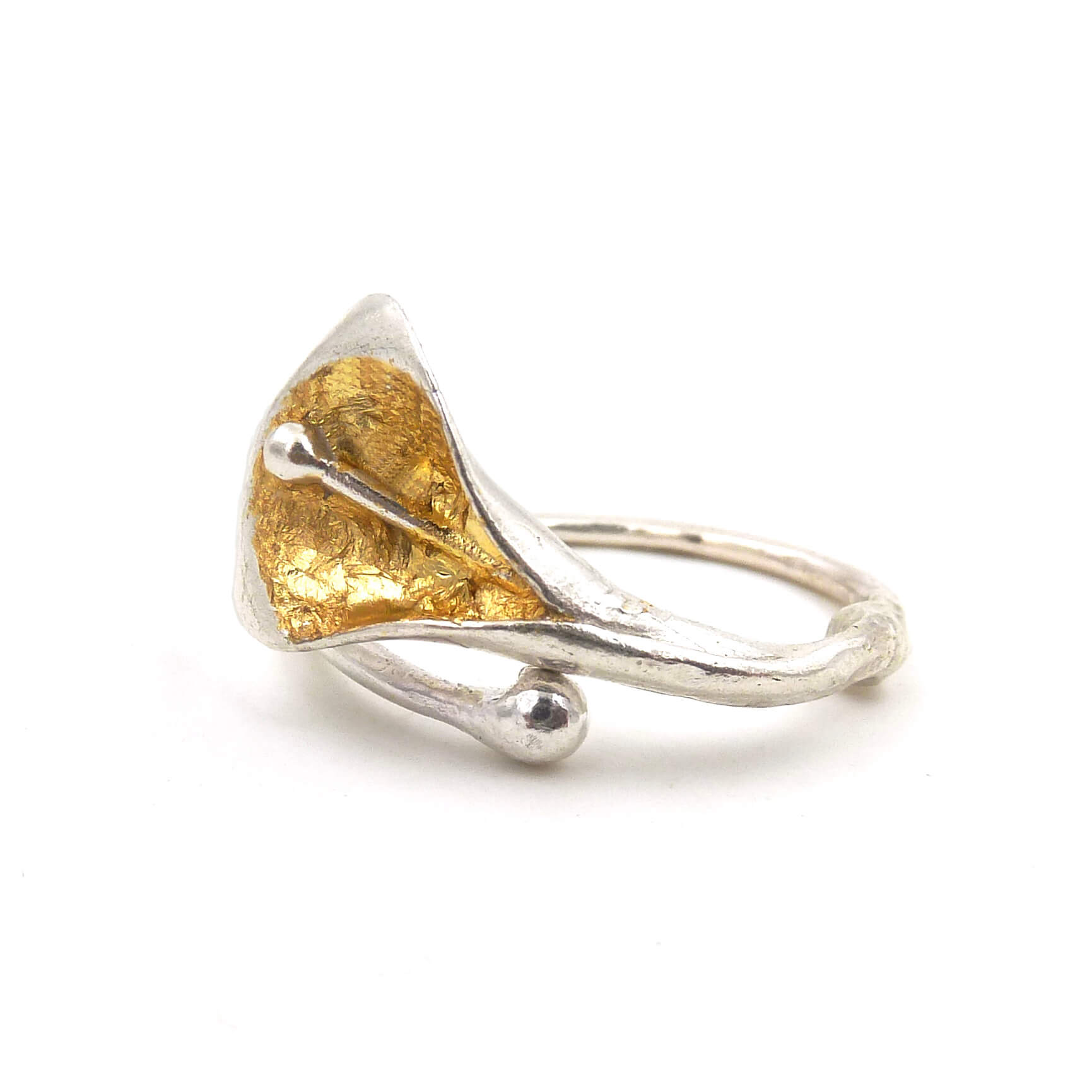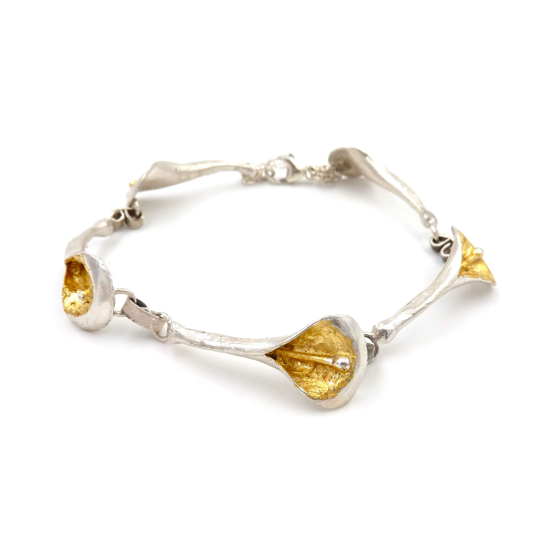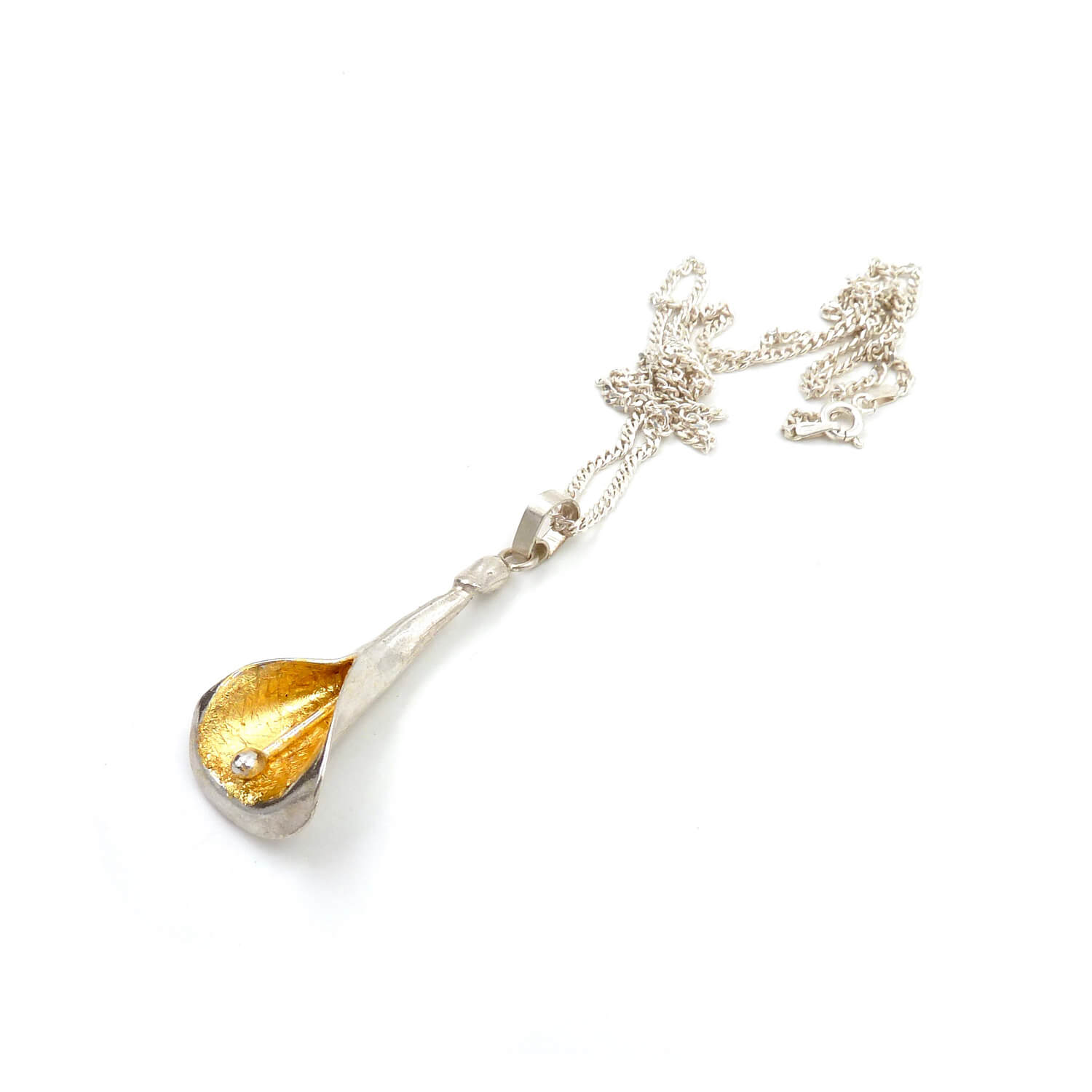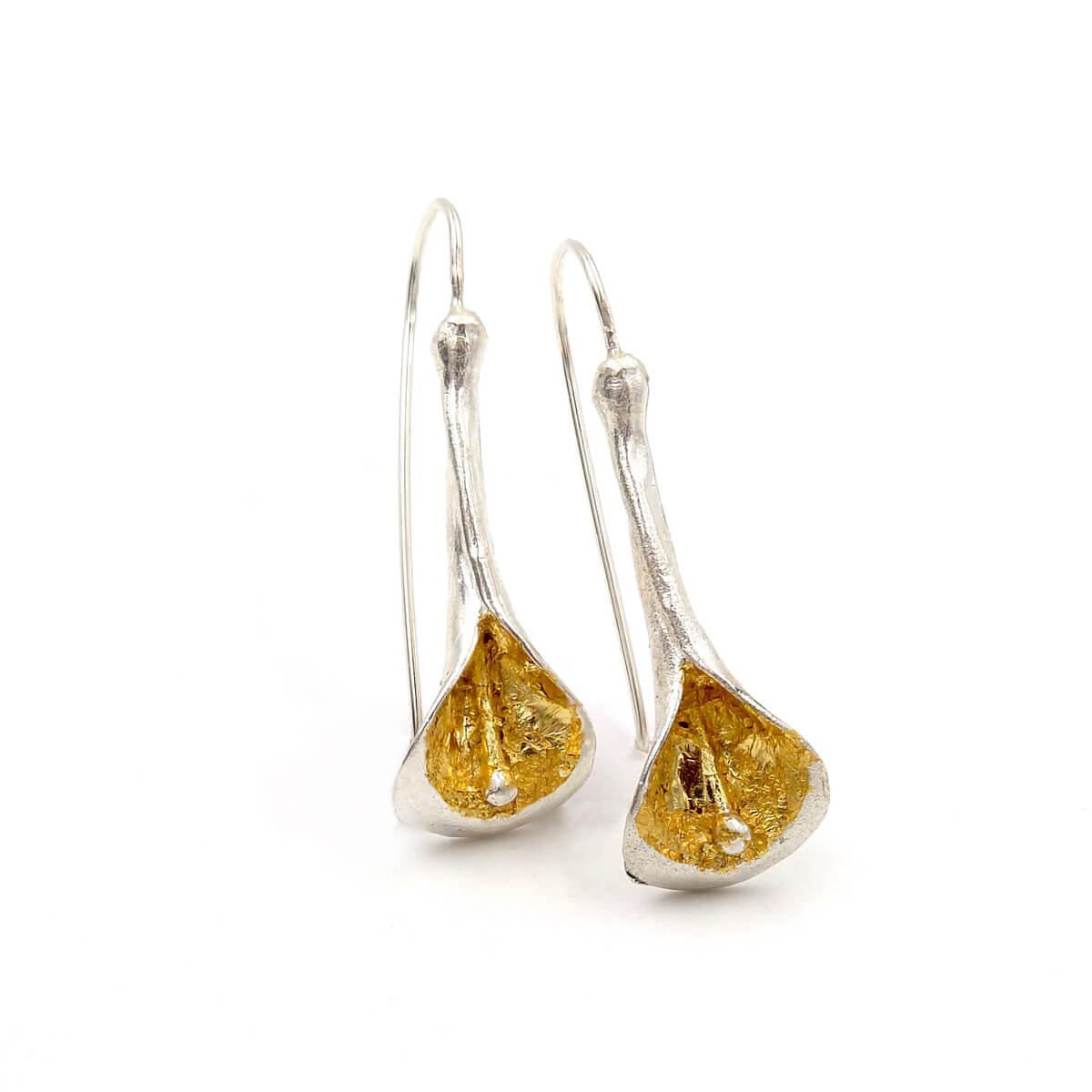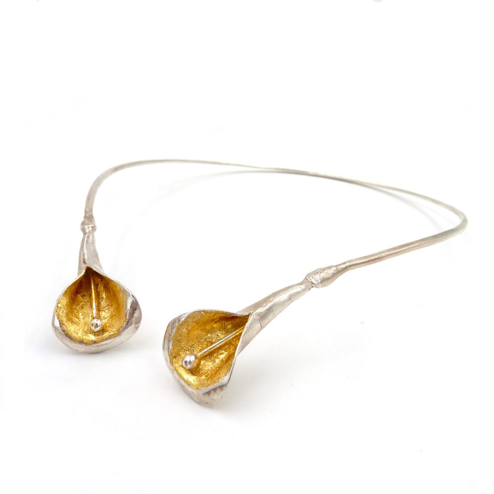 Las Calas se hacen partiendo de chapa de plata que se pliega en diferentes sentidos hasta conseguir el cuerpo de la flor a la que se le suelda el pequeño pistilo de alambre que remata en una bolita.